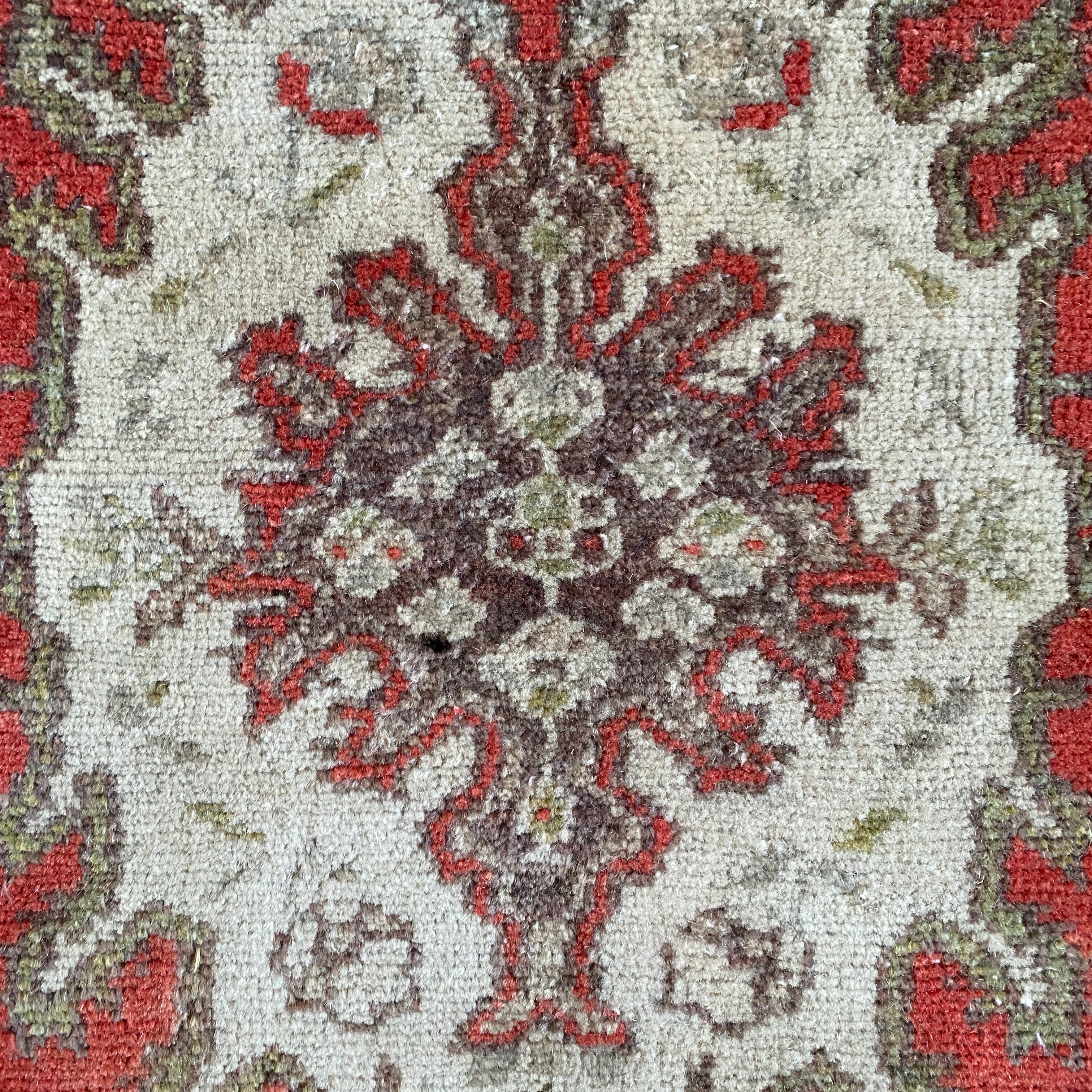 ストーリー…この絨毯は、トルコの中央アナトリア地方にあるUşak/Oushak(ウシャク)地域で花嫁道具として織られた特別な一枚です。現在非常に人気のあるヴィンテージラグですが、現物のヴィンテージ物なのでパイルが薄い部分や、パイルがない部分もあります。しかし、それこそが、このラグをより特別でユニークなものにしています。「織りの芸術」としてその魅力が際立つアイテムです。