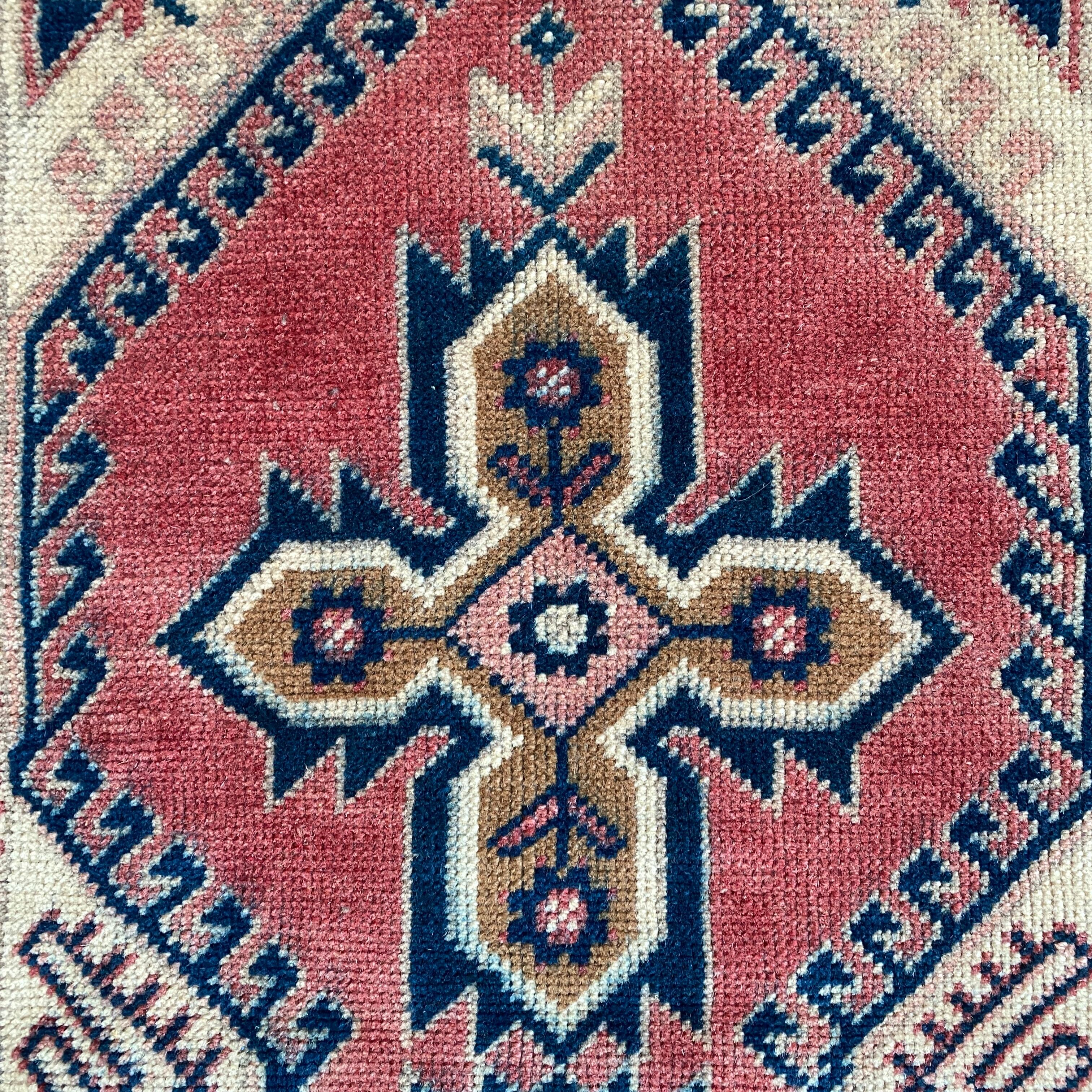 ストーリー…この絨毯は、トルコのアンタルヤ県にあるDosemealti(ドズメアルティ)地域で花嫁道具として織られた特別な一枚です。現在非常に人気のあるヴィンテージラグですが、現物のヴィンテージ物なのでパイルが薄い部分や、パイルがない部分もあります。しかし、それこそが、このラグをより特別でユニークなものにしています。「織りの芸術」としてその魅力が際立つアイテムです。