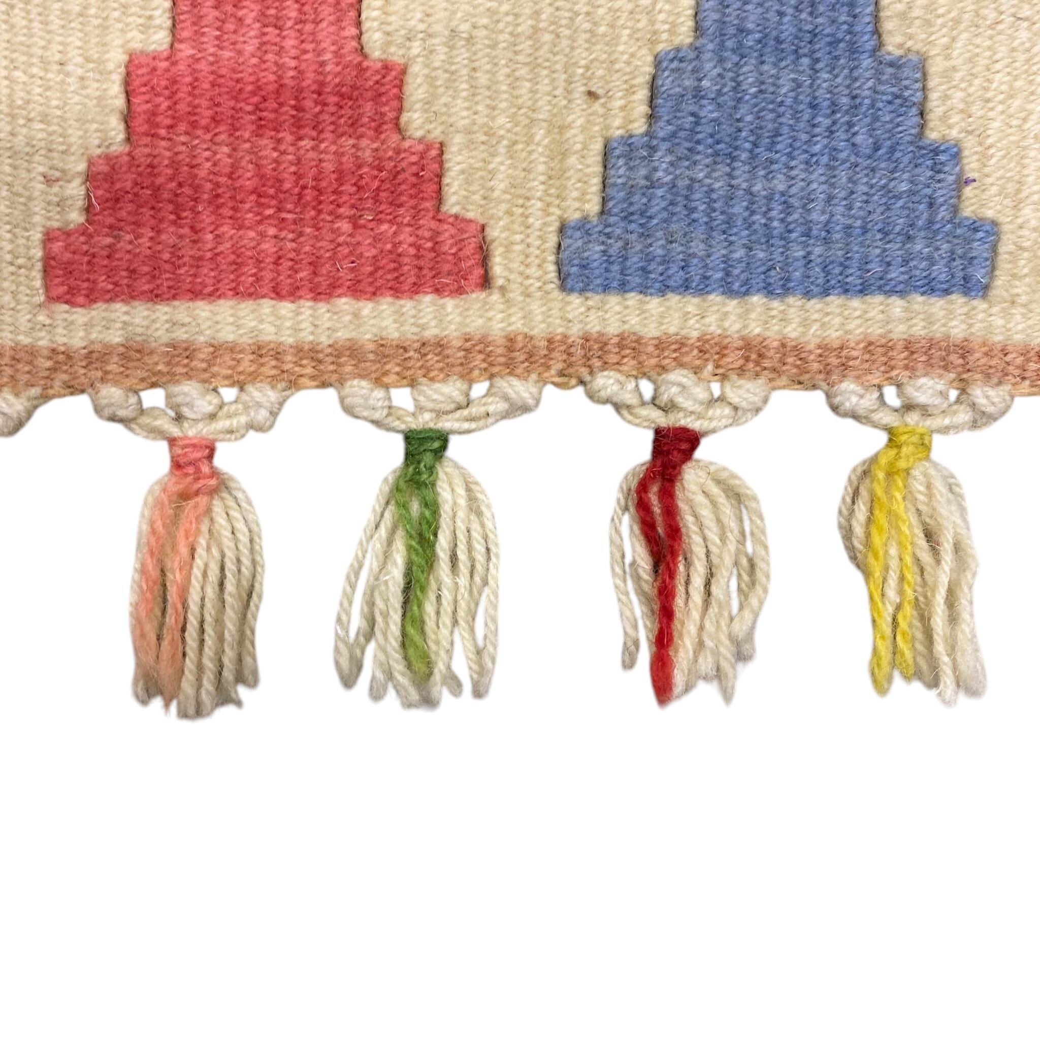 ストーリー…このキリムは、Kayseri(カイセリ)地域の村人もしくは遊牧民によって、カイセリのErciyes(エルジエス)山地域の村で花嫁道具として織られた特別な一枚です。特別でユニークなフリンジが付けられています。「織りの芸術」としてその魅力が際立つアイテムです。